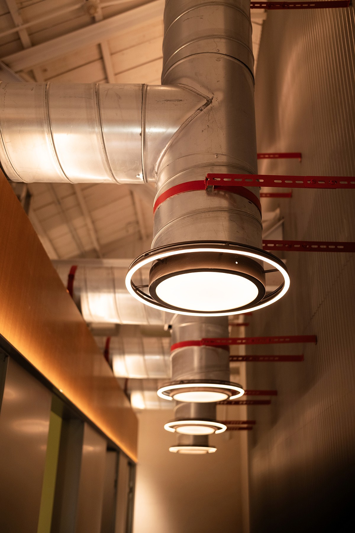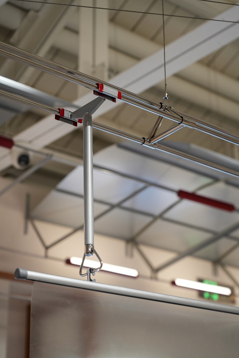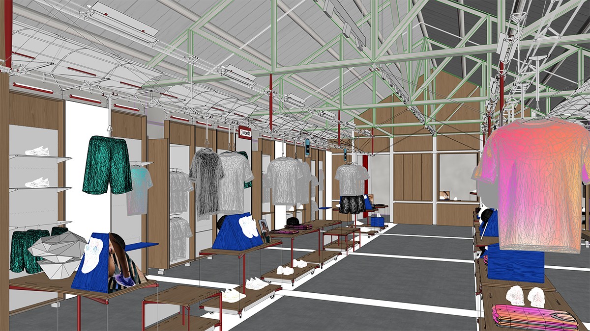The design balances precision engineering with the casual rhythms of street life. A legible "kit-of-parts"—a suspended grid of slender tension cables—hangs beneath the original beams. This lightweight armature allows products to be displayed with a "curated" clarity, devoid of the heavy joinery found in traditional retail.